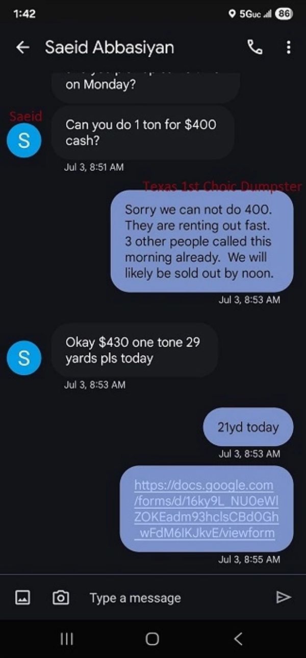 Saied text messages showing him requesting the 21yd dumpster with 1 ton included.