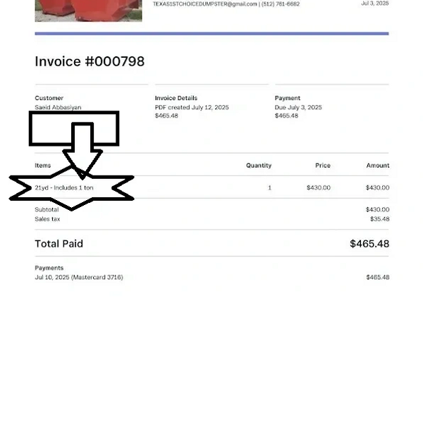 Saeids Receipt clearly states he was renting a 21yd dumpster including 1 ton. He paid this before the dumpster was delivered.